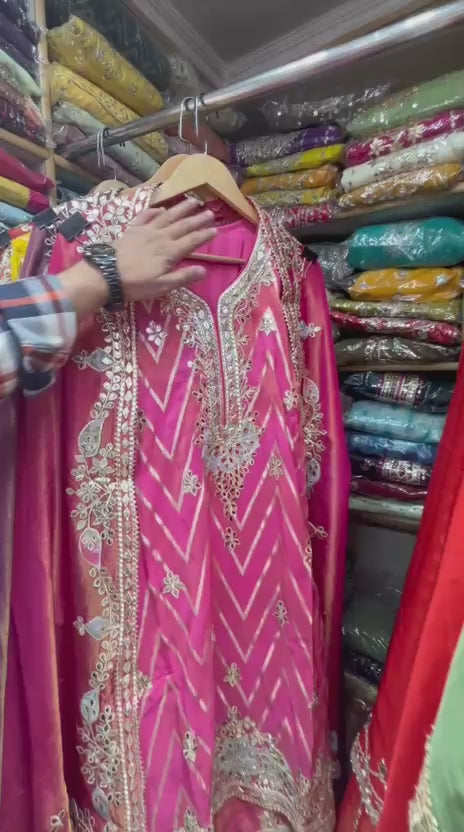 A Ethnic and Traditional Beautiful Leather and Gotta work stitched Sharara suit set crafted in Pure and soft jacquard silk with exquisite embroidery and festive flair!