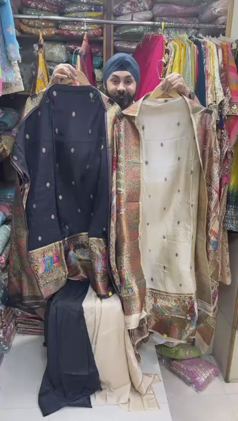 This premium suit is crafted on pure silk jacquard weaving with position printing added only in the weave gaps, giving a clean and rich finish without any figure, animal, or human motifs. The originality is clear from the woven backside with its natural silk-zari shine.