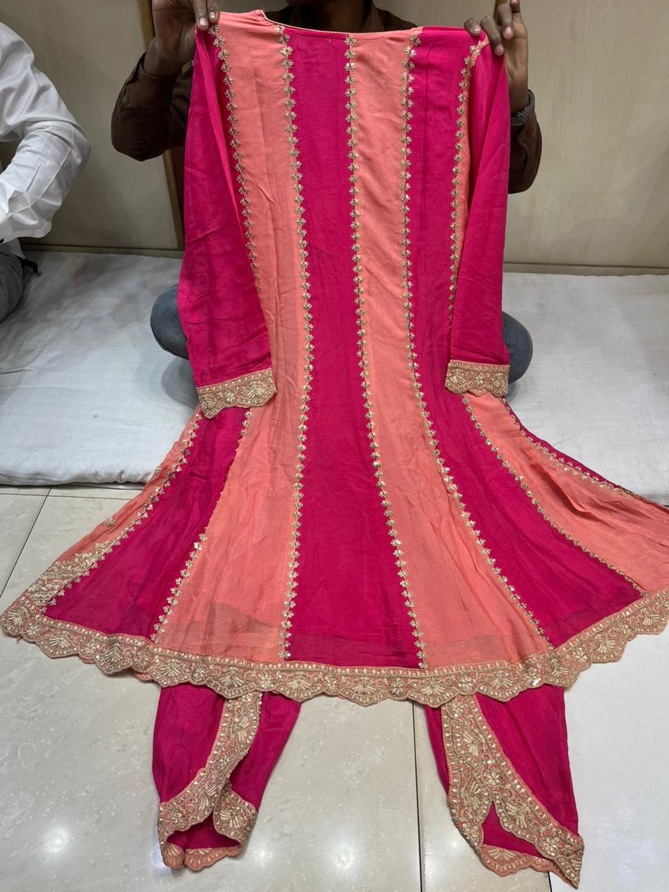 . Intricately Embroidered Neckline , sleeves cuffs ,front back and Tulip with zari and Dori Work